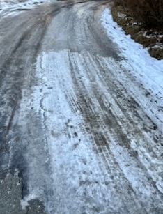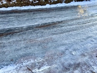 道路の日陰はまだまだこのように凍っているからこんなところは歩けない。こんな道には凶悪さを感ずる。3年前このような氷道で滑って転んだ悪夢のような思い出が蘇る。同じ地域でこれほどの差があるのはとても不思議だ。太陽の力は偉大だ。